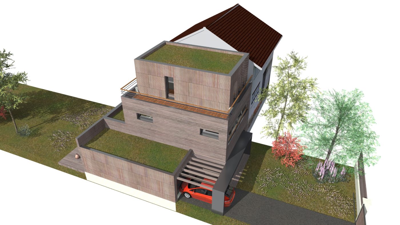 La construction est conçue en ossature bois. Parmi les avantages connus de ce mode constructif, ceux de la facilité de mise en œuvre sont particulièrement adapté à ce terrain bordé de constructions. Le projet est conçu, notamment, afin : D’obtenir une surface importante de plain-pied depuis la rue (rez de chaussée) qui regroupera les pièces de vie et qui bénéficiera d’un ensoleillement Sud. Le bâtiment sera adossé sur le pavillon situé à l’Ouest, sans dépasser son gabarit au sol. De disposer les pièces de nuit au 1er et 2ème étage, de façon à profiter du Sud pour 3 des 4 chambres créées. D’élever la maison sur deux étages principaux et un étage réduit de type « attique ». Ces niveaux profiteront de vues et d’un bon ensoleillement D’implanter le garage côté Est, sur une emprise au sol de 25 m2. Les ouvertures du 1er étage ont été traitées en horizontal, en référence à celles du pavillon sur lequel le projet s’adosse. Le langage architectural est contemporain mais sobre car il a notamment pour but de s’intégrer au tissu urbain existant. Ce dernier, même disparate, délivre une identité attachante qui est en partie due à l’échelle réduite des constructions, aux superpositions de différents matériaux de façade, aux variations de volumes, à la lecture souvent différentiée des niveaux d’habitation. Cette simplicité permettra une compatibilité avec son environnement. Au rez de chaussée, une casquette revêtue de panneaux de résine de type ‘Trespa’ gris souris sera mise en œuvre pour servir de porche, et de support à une pergolas côté garage ; elle unifiera en outre les 2 volumes distincts du rez de chaussée.